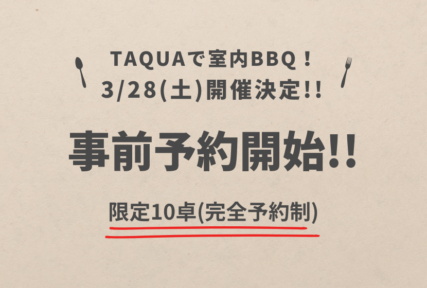 いつも天山多久温泉TAQUAをご利用いただき、誠にありがとうございます。 3月28日(土)、TAQUA敷地内にて 限定10卓の室内BBQが開催決定!! お電話での事前予約の受付を開始いたします。 ━━━━━━━━━━━...